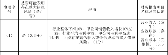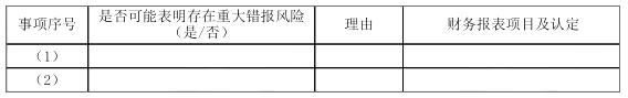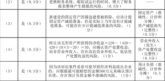 1.针对资料一第(1)至(5)项,结合资料二,假定不考虑其他条件,逐项指出资料一所列事项是否可能表明存在重大错报风险。如果认为可能表明存在重大错报风险,简要说明理由,并说明该风险主要与财务报表项目(仅限于营业收入、应收账款、营业成本、固定资产、资产减值损失、营业外收入、资产处置损益、预计负债)的哪些认定相关(不考虑税务影响)。将答案直接填入答题区的相应表格内。