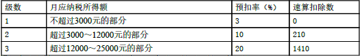 60000÷12=5000(元),税率为10%,速算扣除数为210元。