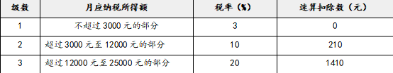 (3)年终奖按12个月分摊后,每月的奖金=30000÷12=2500(元),适用3%的税率。
