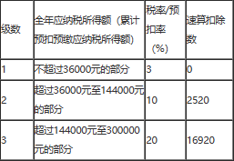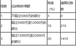 4.年终奖按12个月分摊后,每月的奖金=50000÷12=4166.67 (元),适用10%的税率、速算扣除数为210。 年终奖应纳个人所得税=50000×10%-210=4790(元)。