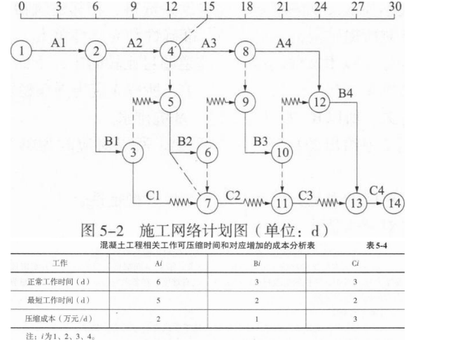 工期优化方案:本题关键线路是A1→A2→A3→A4→B4→C4,其中在第15天末,
