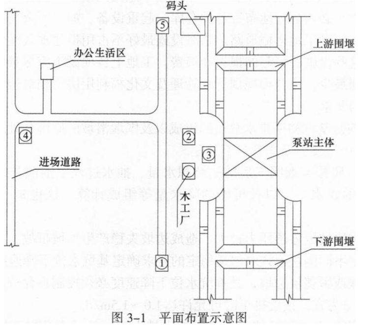 平面布置示意图中①、②、③、④、⑤所对应的 临时设施名称分别为:①为油库;②为钢筋加工厂;③为塔式起重机;④为地磅;⑤为混凝土拌合系统。
