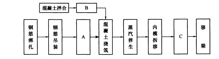 【考点解析】此题主要考查对箱梁预制施工工艺流程的掌握。对于大吨位整体箱梁预制,内模安装应在底腹板钢筋绑扎完成后,所以A是内模安装施工工序;由于采用混凝土集中拌合,需罐车运输,B显然是混凝土运输施工工序;内模拆除后在移梁前应进行预应力张拉作业,所以C是预应力张拉工序。