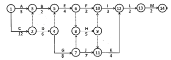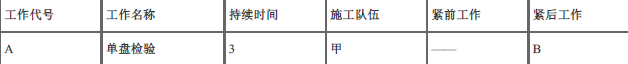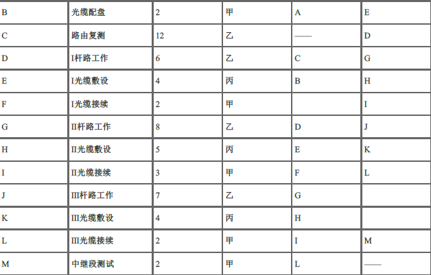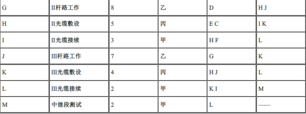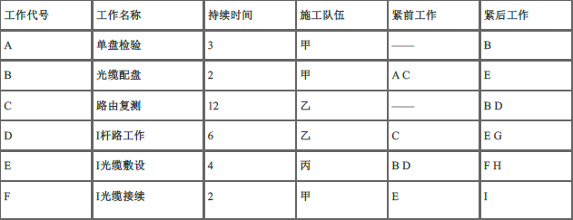 案例题 某施工单位承接架空线路全长120km,分为三个中继段,采用G652光缆,项目部根据现场摸底报告、资源配置计划和施工定额,编制了进度计划,项目部在计划制定过程中进行工作分解,时间估算,责任分工和作业排序见表,一个队同时只能做一项工作,并制定双代号网络图,部分网络图见图