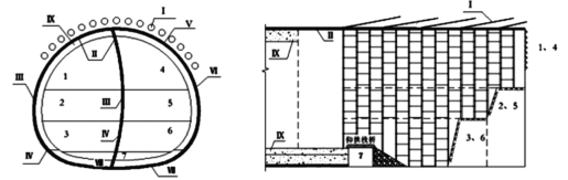 答:Ⅰ-超前支护→1-左侧上部开挖→Ⅱ-左侧上部初期支护→2-左侧中部开挖→Ⅲ-左侧中部初期支护→3-左侧下部开挖→IV-左侧下部初期支护→4-右侧上部开挖→V-右侧上部初期支护→5-右侧中部开挖→VI-右侧中部初期支护→6-右下部开挖→Ⅶ-右侧下部初期支护→7-拆除中隔壁→Ⅷ-仰拱及填充混土→Ⅸ-拱墙二次衬砌