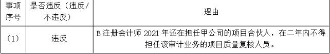 (1)B注册会计师担任了甲公司2019年度至2021年度审计项目合伙人。2022年度未参与审计,也未以任何方式影响审计结果。