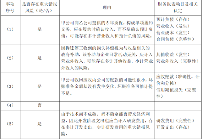 要求:(1)针对资料一第(1)至(5)项,结合资料二,假定不考虑其他条件,逐项指出资料一所列事项是否可能表明存在重大错报风险。如果认为可能表明存在重大错报风险,简要说明理由,并说明该风险主要与哪些财务报表项目的哪些认定相关(不考虑税务影响)。将答案直接填入答题区的相应表格内。