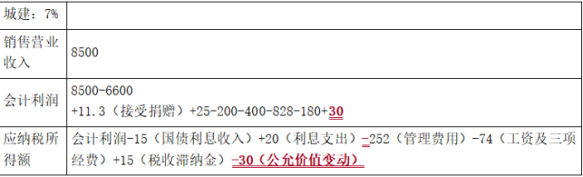 应纳税所得额=258.3-15(国债利息收入)+20(利息支出)-252(管理费用)-74(工资及三项经费)+15(税收滞纳金)-30(公允价值变动)+100(存货跌价准备)