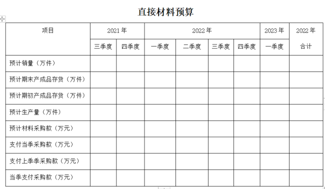 (3)该公司每件产品消耗直接材料10千克,每千克材料单价为0.5元,公司采购材料的付款政策为:当季度支付当季采购款的50%,下季度支付剩余的50%。