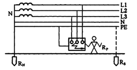 间接接触触电的防护措施有保护接地和保护接零。根据接地保护的方位和方式不一样,系统分为 IT 系统、 TT 系统、TN 系统。下图表示的系统是( )。