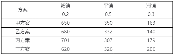 不定项选择题 甲企业是一家生产非电动自行车的生产企业,后与乙企业共同投资成立企业,生产共享电动自行车。甲企业在网络平台开展酒店预订和租车服务。为了提高电动自行车的竞争优势,甲企业进军蓄电池行业。在蓄电池的生产方面,共有甲产品、乙产品、丙产品、丁产品四种产品方案可供选择,每种产品均存在着市场需求高、市场需求一般、市场需求低三种市场状态,对应的概率、损益值(单位:百万元)如下表所示。除此之外,甲企业为了扩大企业发展,开展服务等业务。