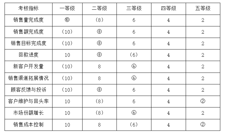 ( )和○分别对应张主管和黄主管的评分。十项指标对应的分数总和为绩效考核的最终分数。90-100分为优秀,80-90分为良好,70-80分为合格,60-70分为基本合格,60分以下为不合格。