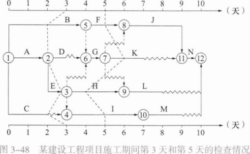 某建设工程项目施工期间第3天和第5天的检查情况如图3—48所示,关于该项目进度情况的说法,正确的是( ):