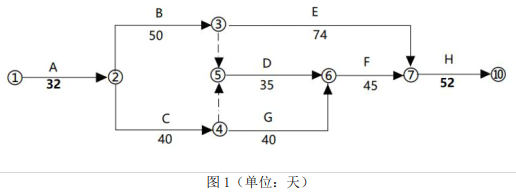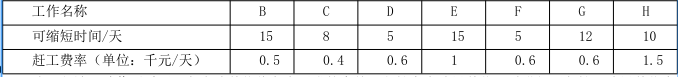 第二步:可压缩的关键线路为:B→D→F→H 和 C→G→F→H 两条,经比较,F 工作可压缩 3 天,赶工费用为 3×0.6=180 万元;