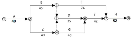 第一步:可压缩的关键线路为:B→D→F→H,经比较,B 工作可压缩 5 天,关键线路变为:B→D→F→H