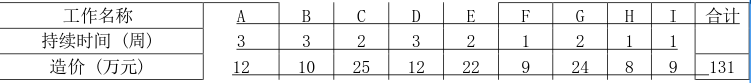 A+B+2/3D+1/2E+C+F=12+10+2/3×12+1/2×22+25+9=75 (万元);到第 9 周应完成的预算造价可从上图中分析,应完成 A、B、D、E、C、F、H ,故:A+B+D+E+C+F+H=12+10+12+22+25+9+8=98 (万 元)