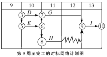 1. 根据第 9 周的进度检查情况,绘制的实际进度前锋线如下图所示。