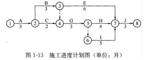 1.该建设项目初始施工进度计划的关键工作是:A、B、G、I、J。计划工期=3+3+3+5+3=17个月。