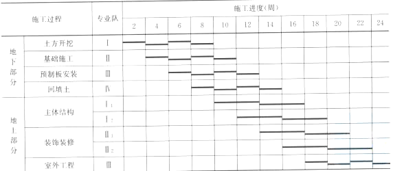 4.当第一幢地下工程完成后即可进行地上工程,则总工期应按如下式计算:T=(T地下-搭接时间)+T地下=(14-6)+16=24周