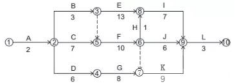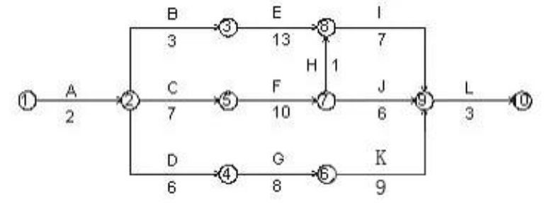 调整后的网络图关键线路为:A→C→F→K→L。此时总工期为:2+7+10+9+3=31(周)。