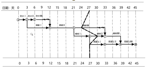 1.(1)防水施工流水节拍为 3天;钢筋施工流水节拍为 9 天;模板施工流水节拍为 6 天;混凝土施工流水