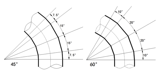 2.按照斜接弯头的组成形式的规定,如下图所示,对公称尺寸大于400mm的斜接弯头可增加中节数量。由此可得45°、60°弯头中间管节角度a值分别为15°、20°。