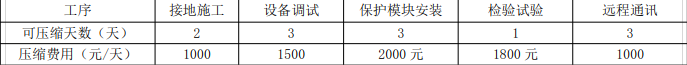 (2)压缩工期和费用表中,需要优先找到关键工序的工作进行压缩工期,设备调试和检验试验无疑是首选,检 验试验费用低,优先压缩一天,之后设备调试再进行压缩一天。