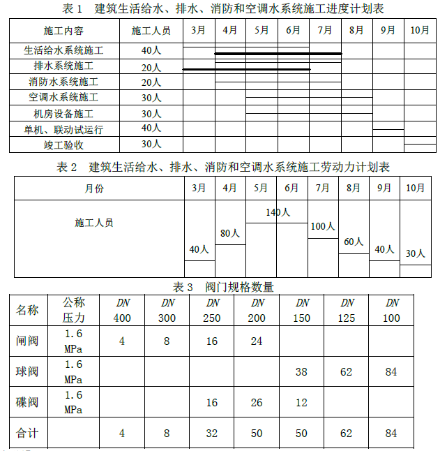 表1建筑生活给水、排水、消防和空调水系统施工进度计划表