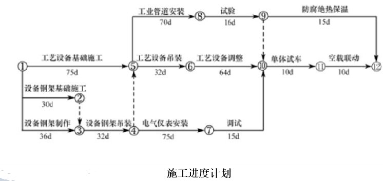 2. 按原计划设备钢架吊装与工艺设备吊装工作不能连续作业。因为塔机在设备钢架吊装完毕至工艺设备吊装之间有7天自由时差(因为工艺设备基础施工需要75天,第76天才能进行工艺设备吊装,而设备钢架吊装在第68天就完成了,塔机在现场要闲置7天)。