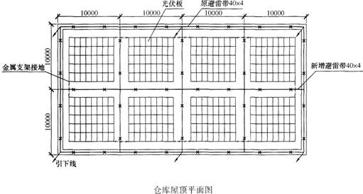 根据图示,施工后的仓库建筑为二类防雷建筑,屋顶避雷网格的间距为10m×10m。(来自规范建筑物防雷设计规范GB50057-2010)