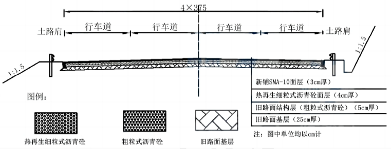 案例题 北方平原地区某一级公路位于主城区附近,沿线风景秀丽、居民较多,路线附近有大型湖泊。公路起讫桩号为K0+000~K26+500,双向四车道。该公路通车10 年后,沥青混凝土上面层出现龟裂、车辙等病害,需要大修处理。经设计单位现场勘察,该公路基层承载力良好,设计方案采用现场热再生工艺。对四个行车道的上面层进行全厚度再生施工,然后罩一层3cm 厚的SMA-10 新面层。路面结构设计示意图如图 所示(全线无平曲线加宽、无桥梁隧道)。