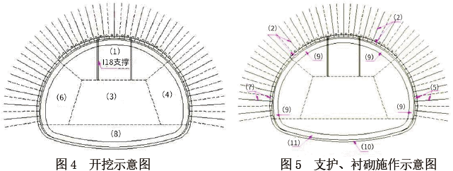 环形开挖留核心土法可用于Ⅴ~Ⅵ级单洞双车道(或一般跨度)隧道中,也可用于Ⅲ~Ⅳ级单洞