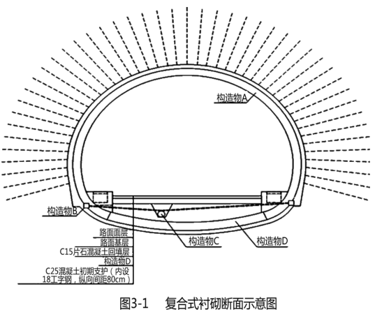 案例题 某施工单位承接了1.8km的山区二级公路工程项目,其中包含一座长260m的双车道隧道。该隧道围岩主要为IV级,采用复合式衬砌,衬砌断面设计如图3-1所示。