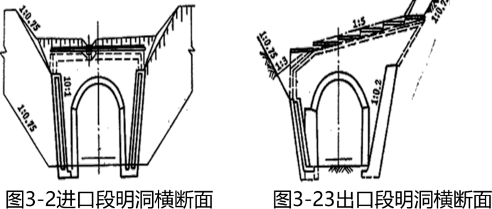 隧道进口洞顶覆盖层较薄,出口段的路堑地段受落石和塌方危害,隧道进出口段均设置12m的拱式明洞。其中进口段和出口段的明洞横断面如图3-2和3-3所示。