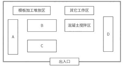 事件一:施工单位结合现场情况,在其中一个生产区区内布置了拌合站与梁板预制场,考虑施工方便并减少二次搬运,部分工作区域布置示意图如图所示,工作区域包括:梁板预制区、梁板成品堆放区,砂石料堆放区、钢筋加工堆放区、模板加工堆放区,混凝土搅拌区、其他工作区。