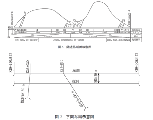 案例题 某公路隧道设计为双向四车道分离式隧道,沥青混凝土路面,隧道合同总工期为36个月。左右隧道分别长4855m,中线间距30m,隧道最大埋深850m,纵坡为3%人字坡,其地质条件为:岩性为砂岩、石灰岩,局部有煤系地层;瓦斯含量低,属瓦斯隧道;穿越F1、F2、F3三条断层;地下水发育。左右洞围岩级别均为:Ⅱ级3415m,Ⅲ级540m,IV级310m,V级590m。在距进口2100m(对应里程K27+850)处设计了一座斜井,斜井长450m,向下纵坡5-8%,隧道纵断面示意图及平面布置示意图分别见下图。