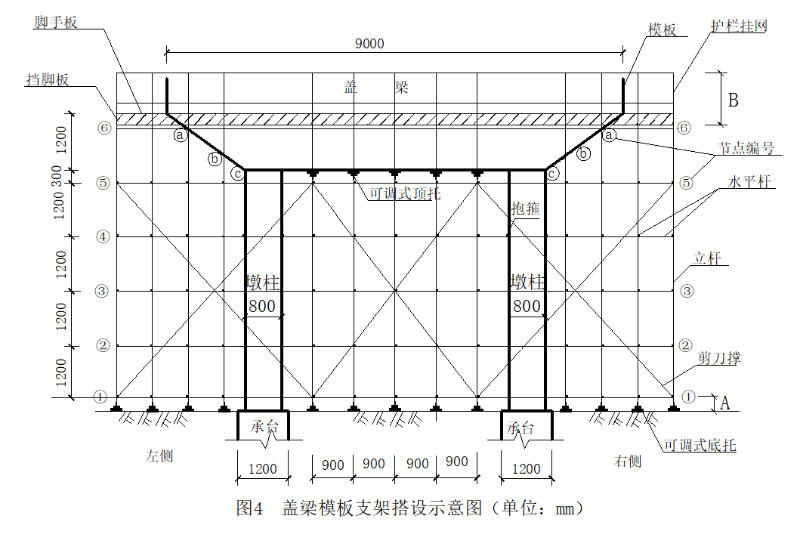 存在问题: (1) 未对支架搭设范围的地面进行硬化。(2) 支架地基未设置排水设施。 (3) 斜撑搭设与支架搭设未同步进行。(4) 盖梁支撑架间距过大。 (5) 支架未进行预压。