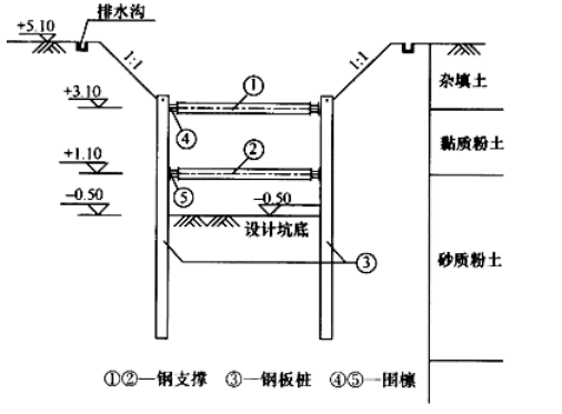 3.(1)拟将表层杂填土挖出后再打设钢板桩错误,应先钢板桩后挖除表层杂填土。