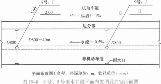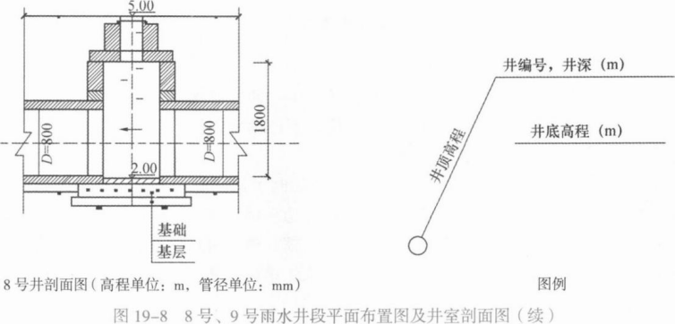 案例题 某公司承建一段新城镇道路,其雨水管道位于流砂地区,设计采用D800mm钢筋混凝土管,相邻井段间距40m,8号、9号雨水井段平面布置图及井室剖面如图19—8所示,8号、9号井类型一致。