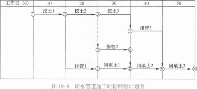 内容五:管道施工划分为三个施工段,时标网络计划如图19-9所示(有两条虚工作需补充)。