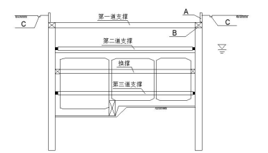 案例题 某单位承接某市地铁车站工程施工,该车站位于城市繁忙交通路口,车站北侧为主干路下穿隧道(隧道北侧为既有写字楼),西侧为现有城市主干道(主干道西侧为既有小区),东侧为某住宅小区,南侧为待开发场地(原有建筑物已拆除),城市道路下管道纵横交错。施工单位进场后,针对本工程周边环境制定了各阶段平面布置图及交通导行方案。该地铁车站为地下两层,围护结构采用地下连续墙,设置三道支撑,结构剖面图如图7-1所示。