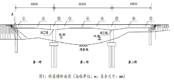 某公司承建一座城市跨河桥梁,施工期间航道不中断。桥梁的上部结构采用三跨式预应力混凝土连续刚构,跨径组合为48m+60m+48m;下部结构墩柱基础采用混凝土钻孔灌注桩;桥下河流的最高水位高程16.55m,常水位高程为14.00m。桥面立面图如图1 所示。项目部根据施工环境编制的施工方案如下: