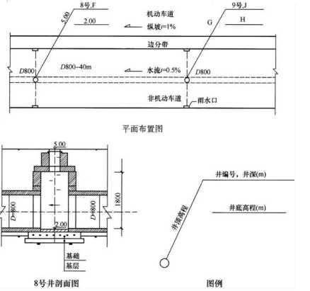 案例题 某公司承建一段新城镇道路,其雨水管道位于流沙地区,设计采用D800mm钢筋混凝土管,相邻井段间距40m,8号、9号雨水井段平面布置图及井室剖面图如下所示,8号、9号井类型一致。