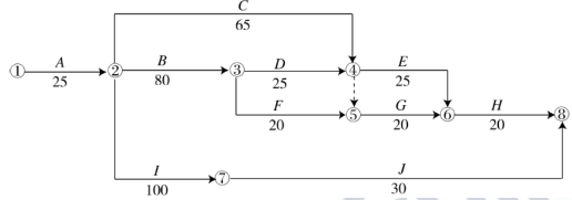 (2)关键线路为:A→B→D→E→H(①—②—③—④—⑥—⑧)。