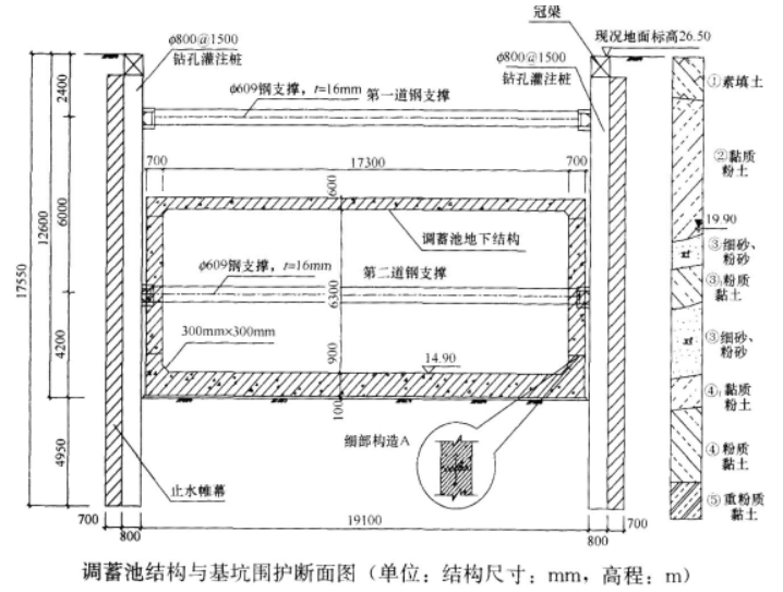 3.基坑侧壁渗漏继续开挖的风险:从背景资料的调蓄池结构与基坑围护断面图中地质柱图部分可以看出,基坑挖到8m以下,直到坑底土质多为细砂、粉砂土、粉质黏土,渗水夹带泥沙会造成围护结构背后土体过大沉降,附近建构作物沉降超标,严重的会导致围护结构背后土体失去抗力造成基坑坍塌。