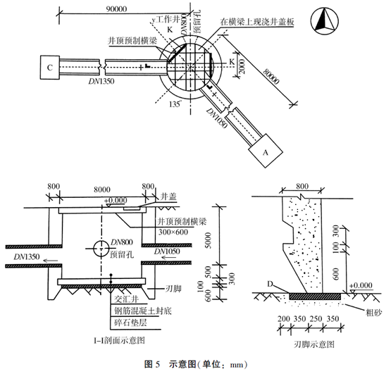 (3)下沉辅助措施有:①沉井外壁采用阶梯以减少下沉摩擦阻力时,在井外壁与土体之间应有专人随时用黄砂均匀灌入;②采用触变泥浆套助沉;③空气幕助沉;④爆破方法开挖下沉。
