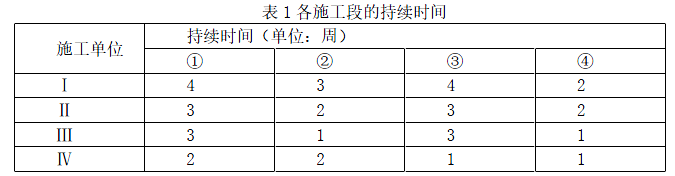 Ⅰ、Ⅱ、Ⅲ、Ⅳ在各施工段上持续时间如表 1 所示: