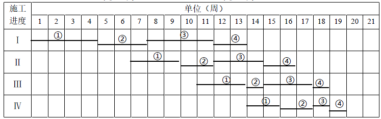 (2)项目部将 58cm 厚水泥稳定碎石基层,8cm 厚粗粒式沥青混合料底面层,6cm 厚中粒式沥青混合料中面层,4cm 厚细粒式沥青混合料表面层四个施工过程分别用Ⅰ、Ⅱ、Ⅲ、Ⅳ表示,并分别划分成 4 个施工段①②③④。