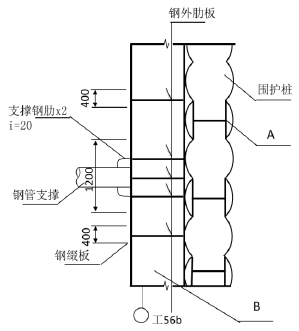B—围檩;围檩将围护结构连成整体,收集围护结构应力传递到支撑,避免支撑部位应力集中。