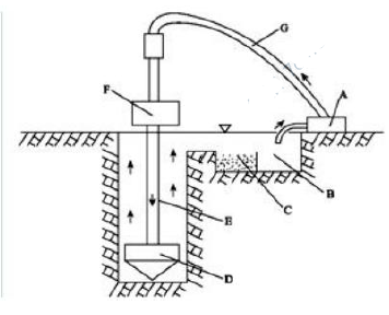 A 泥浆泵,B 泥浆槽(池),C 沉淀池。该回旋钻机属于正循环回旋钻机。